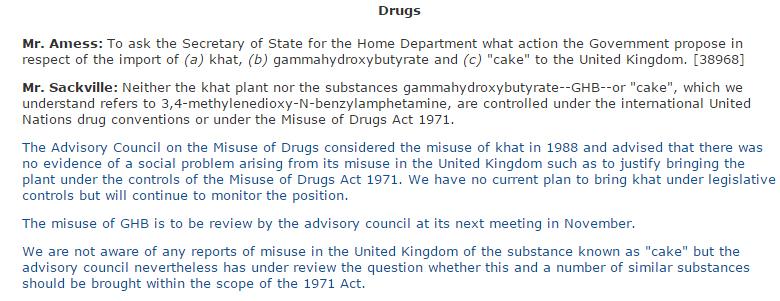 David amess cake. The Conservative MP 69 is. To ask the Secretary of State for the Home Department what action the Government propose in respect of the import of a khat b gammahydroxybutyrate and c cake to the United Kingdom.